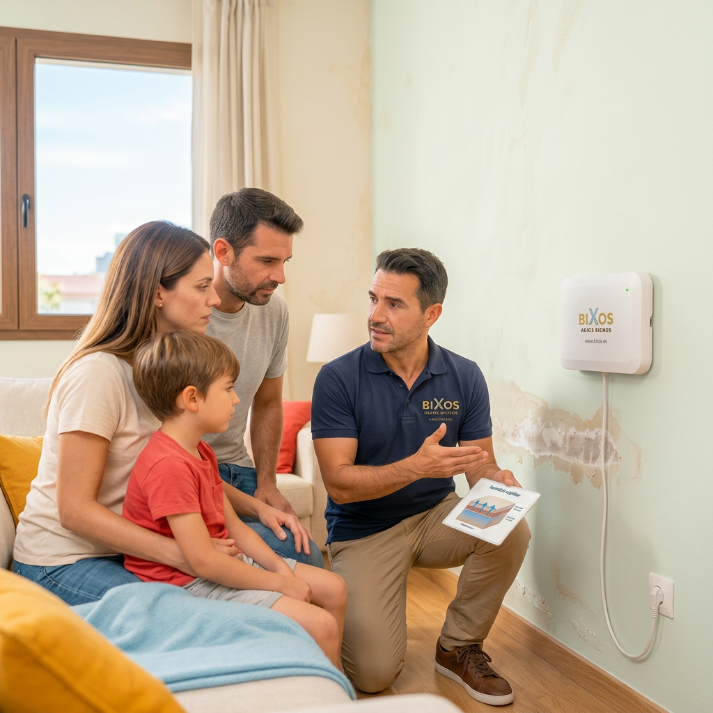 Frente a esa lógica reactiva, Bixos plantea algo diferente: un sistema técnico que actúa de forma continua sobre la humedad por capilaridad — el factor que más favorece la presencia de insectos — sin químicos, sin fumigaciones, sin mantenimiento. Conectado a la red eléctrica, funciona las 24 horas sin interferir en la vida diaria del espacio. Cuando se controla la humedad, los insectos desaparecen. No hay solución más eficaz que quitarles el hábitat.